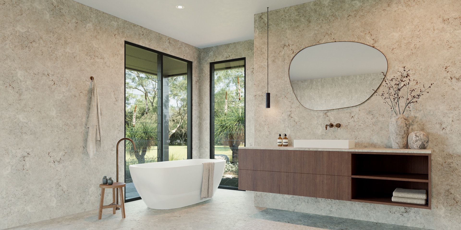 In contrast, the interiors unfold in soft, natural tones inspired by travertine, light timbers and earthy textures. The result is a gentle juxtaposition: grounded and bold on the outside, warm and calming within.